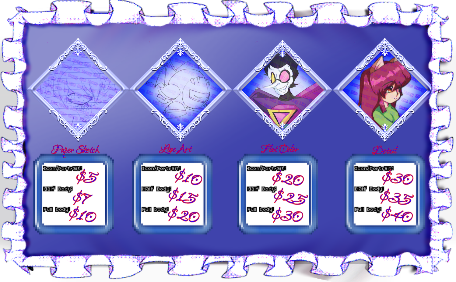 I can do many styles! but here are my main styles that I can and will do! I would rather use my styles I have provided as these are my original works but I do not mind trying to draw in a certain style :3